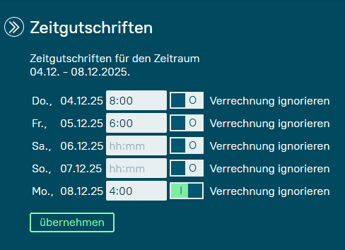 - Ist eine Dauer in Stunden und Minuten eingetragen, so gilt diese vorrangig als Zeitgutschrift für diesen Tag. Mit dieser Funktion können u. A. die Zeitgutschriften aus Schichtplänen gesichert werden.