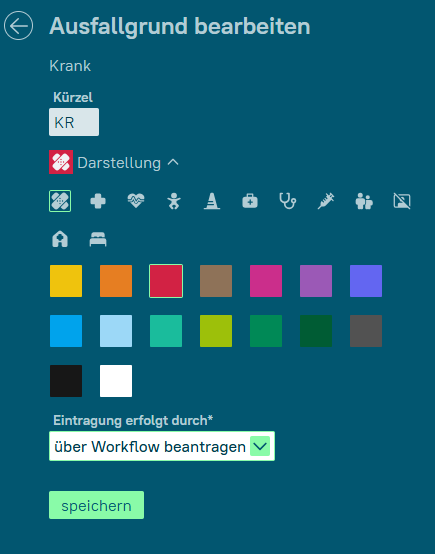 Gehen Sie über 'Einstellungen' auf 'Abwesenheiten' und rufen Sie dort die gewünschten 'Krankheitsbedingten Abwesenheiten' auf. Stellen Sie 'Eintragung erfolgt durch' auf 'über Workflow beantragen'. Speichern Sie die Änderung an. Die entsprechend konfigurierten Krankheitsarten stehen Ihren Mitarbeitern für die Beantragung zur Verfügung.