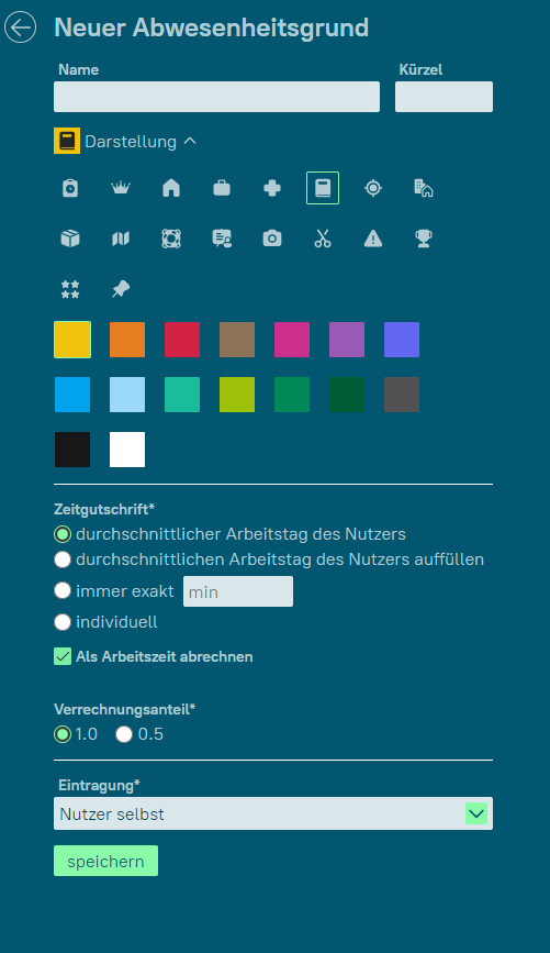 Geben Sie hier zunächst den Namen des Grundes ein und wählen Sie ein Icon. Anschließend können Sie angeben, wie hoch der ‚Verrechnungsanteil‘ für den Abwesenheitsgrund sein soll, d.h. ob die Zeit ganz oder nur zur Hälfte gutgeschrieben wird.