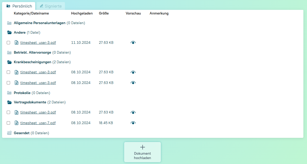 Die persönlichen Dokumente bilden die digitale Variante der Personalakte ab. Als Administrator können diese von allen Mitarbeitern eingesehen und verwaltet werden. Mitarbeiter hingegen sehen nur die Ihnen freigegebenen Inhalte Ihrer eigenen Personalakte.