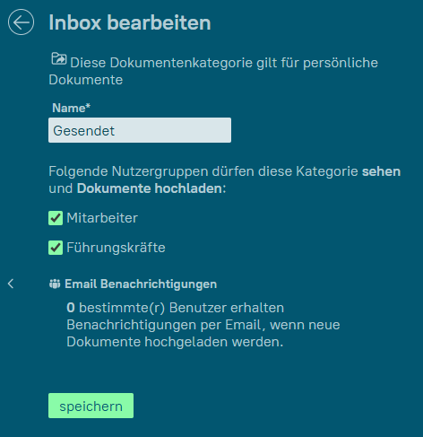 Die mit diesem Symbol gekennzeichnete Kategorie hat spezielle Eigenschaften. Dies ist die Kategorie in der zunächst alle Uploads landen. Die Dokumente von allen Mitarbeitern, die hierin liegen, werden Ihnen in der Inbox zur Bearbeitung angezeigt. Sie können den Namen der Kategorie frei definieren. Beachten Sie, dass die Sichtbarkeit auch die Upload-Möglichkeit für den entsprechenden Nutzerkreis steuert. Sie können im Subdialog definieren, wer nach erfolgtem Upload eine Benachrichtigung per E-Mail erhalten soll.