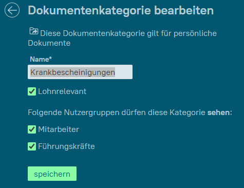 Zum Editieren klicken Sie eine Kategorie an. Sie können den Namen ändern und entscheiden, ob Dokumente dieser Kategorie grundsätzlich "lohnrelevant" sind. Zudem können Sie die Sichtbarkeit konfigurieren: