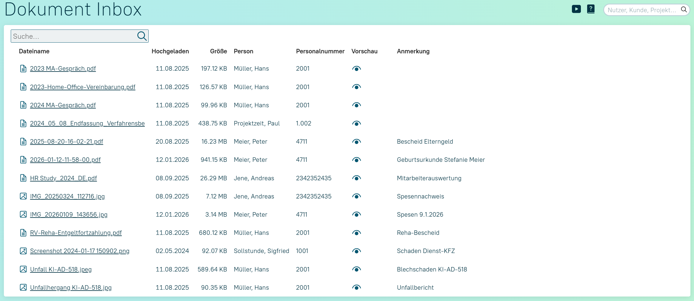 In der Inbox werden sämtliche Dokumente angezeigt, die bei den Mitarbeitern im Upload-Verzeichnis liegen. Sie behalten die Hoheit über die Personalakten und entscheiden, welche Dokumente wohin sortiert oder gar gelöscht werden.